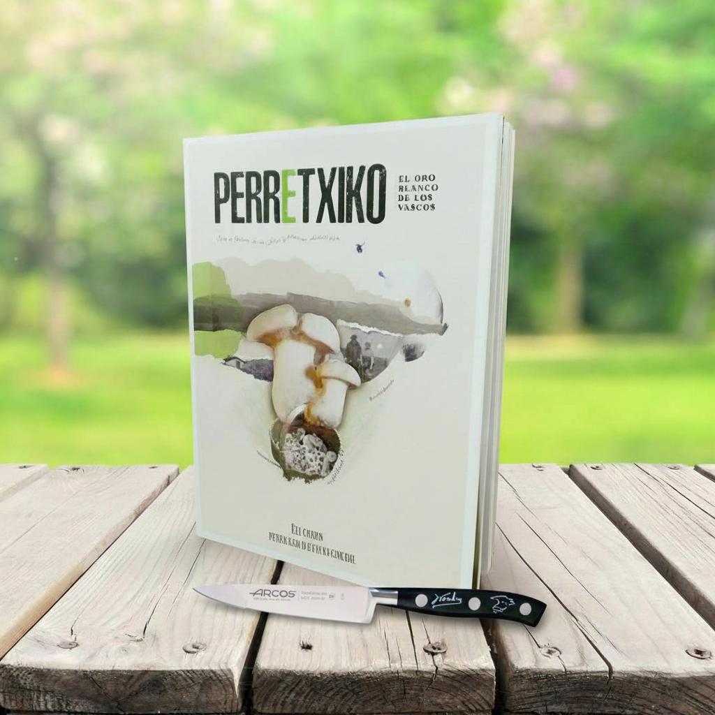 El pack incluye el libro «Perretxiko, el oro blanco de los vascos» y el cuchillo puntilla ARCOS en negro con la firma de Karlos Arguiñano serigrafiada.