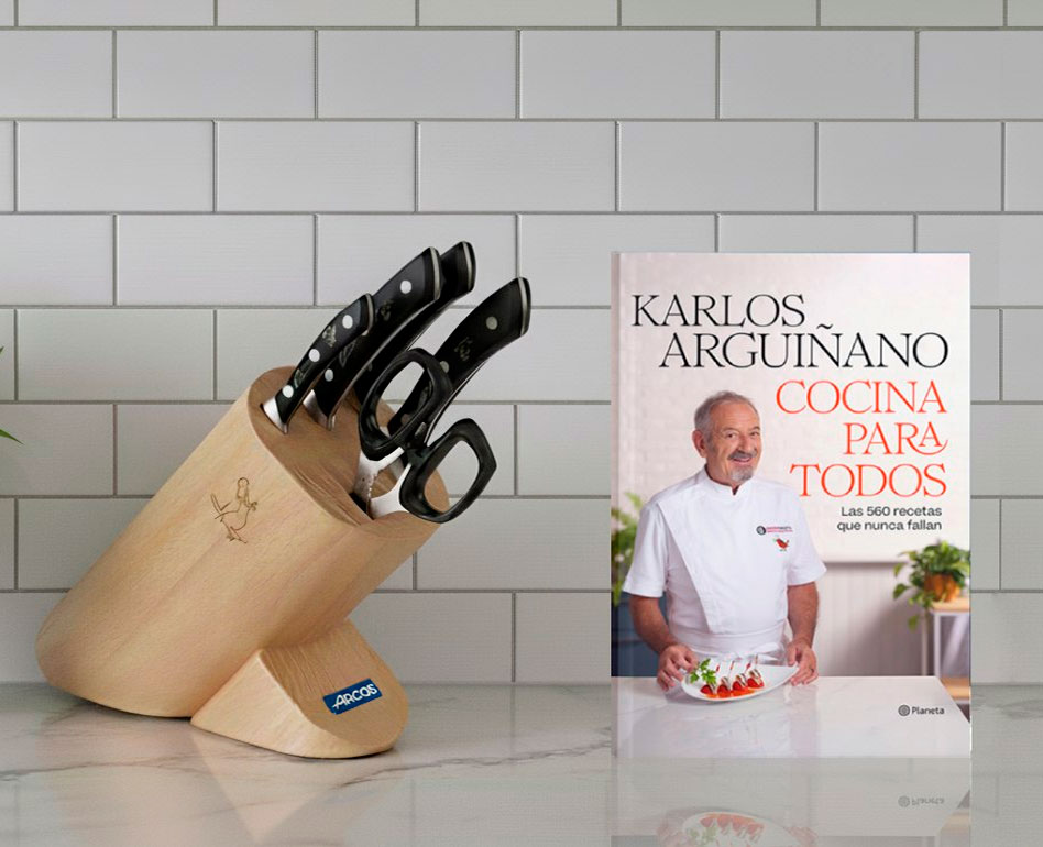 Pack exclusivo Karlos Arguiñano: Libro FIRMADO + Taco de cuchillos ARCOS